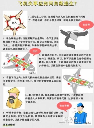 图片来源长城网 至昨天,马航客机失联已超过80个小时,这一突发事件牵动了无数网友的心。尽管飞机是世界上最安全的交通工具之一,但不免还是会出现事故。掌握紧急逃生的相关知识,对危难时刻的自救就起着重要的作用。有专家称,飞机失事后的90秒钟内,是逃生的“黄金”时间,在“黄金”时间内我们该怎么办? 网友总结“黄金”时间逃生秘籍 1、专家说,50%的乘客都是结队旅行,所以他的第一个劝告是:“如果你与家人一道旅行,应该坚持不让航空公司将你们分开。原因很简单,如果你们坐在机舱里的不同地方,在逃生前,你们总想先团聚,而这是很危险的。” 2、学会解安全带 这听起来有些可笑,但却是非常重要的。“当你要解开安全带时,会下意识地想到解开汽车上安全带的方法,你会去按按钮,但在飞机上,你需要打开插销。如果你不能解开安全带,逃生的机会就很渺茫了。” 3、距离逃生口近 专家在评估了2000名幸存者的座位后得出了一些经验法则。他说:“幸存者在逃生时要走的平均距离约为7排座位,所以,你可以选择在这个范围内就座。 4、背朝飞行方向 如果飞机的座位都是面向后的,乘客会更加安全,但专家说:“问题是,大部分乘客都不愿意背对着飞行方向。”在军事飞机上,座位的安排常常是面向后的。 5、带上防烟头罩 如果你能从冲撞中幸存,下面要面对的就是大火和烟雾。“烟雾含有有毒气体,过多地吸入将导致死亡。”专家在旅行时会带上一个防烟头罩,但他警告说,如果你也想带上这样的用具,就需要学会如何使用,否则会为戴上它而浪费时间。 6、听乘务员讲解 登机后要认真听取乘务员的讲解,阅读安全条例。在发生坠机前,按照乘务员的指示采取防冲击姿势:小腿尽量向后收,超过膝盖垂线以内;头部向前倾,尽量贴近膝盖。专家说:“防冲击姿势是乘客要学会的一个重要方法,它可以减少你被撞昏的风险 飞机高空解体 牢记三种逃生技巧 高空解体:空中也要系好安全带 如果遇到高空解体的状况,不论坐在飞机的哪一个部位,生还希望都很渺茫。即便如此也要在空中系好安全带。不然的话,飞机尚未坠地,在空中翻滚的过程中,乘客就已经在机舱中被来回撞击而丧命。 起飞失事:事先观察紧急出口位置 起飞后失事有可能是因为飞机出现故障或遭遇恶劣天气。如果出现故障却没有爆炸起火,机上乘客有可能全部获救;如遇恶劣天气特别是从空中下降到地面的气流,飞机就会坠毁。无论哪种原因,乘客在起飞前尽量数一下从你的座位到出口之间有多少座位。 降落坠毁:尽快远离残骸 一般飞机在降落时头稍低,这时机头最容易遭到撞击,机尾则完好无损,这种状况下,坐在机尾的座位是最安全的。只要所坐位置没有发生撞击和爆炸,乘客在保持头脑冷静的情况下,尽快远离残骸,生还几率最大。 专家释疑:没有绝对的“最安全座位” 此外,据扬子晚报报道,如今的人们更为关注坐在飞机的“哪里”最安全。“这个问题目前尚没有定论,与具体飞行事故相关。”南京一家航空公司的安全技术部门负责人说,“如果飞机发生碰撞或者是可控触地,前排位置反而更危险。而在这次韩亚的事故中,飞机尾部撞地,后排位置更危险。” 另外,诸如“飞机越大越安全”这样的说法,似乎已成为人们对飞行安全性能的一则评价标准。此外,一名业内人士近日表示,培养一名波音737或757飞机机长需要8年,而培养一名波音777或747机长需要10年。那么,究竟是什么因素决定飞行安全?“飞机的飞行安全与飞机特性、飞行员技术和飞行环境密切相关,这是一个人—机—环境组成的闭环系统,任何一环出现问题,都将影响飞行安全。”业内人士表示,人、机、环境三因素决定飞行安全。