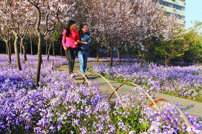4月1日,市民在开满二月兰的林中漫步。 据悉,二月兰具有有效控制裸露土地扬尘起沙、抑制杂草生长、耐荫性强、管理粗放等特点。市园林局在引种成功的基础上,于去年9月份在市区青岛路、北京路、烟台路等14处8.5万平方米的林下播种了二月兰。目前,这些经过园林工人精心养护的二月兰已精彩绽放,吸引着众多市民驻足欣赏。