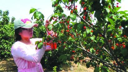 一位市民正兴致勃勃地在五莲县户部樱桃园采摘樱桃。 自5月中旬户部樱桃园开园以来,游客一直络绎不绝,每天可达2000余人次,这里成为日照市民游春消夏的好去处。据了解,户部樱桃采摘将持续到6月中旬。 (本报通讯员郑林 摄)