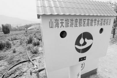 6月17日,山海天旅游度假区苏家村村民用射频卡控制器抽出的水浇灌茶园。射频IC卡控制器是安装在机电井旁的控制设备灌溉系统,在启动和关闭水泵的同时计量水量和电量,村民使用射频IC卡控制器灌溉,每亩比传统浇灌节省一半的费用,还节省时间和人力。截至目前,山海天旅游度假区新建提水泵站2座,安装射频卡控制器18台,铺设电缆及PE管道5000米,出水口18处,发展节水灌溉面积1200亩。 (本报记者 路杰 摄)