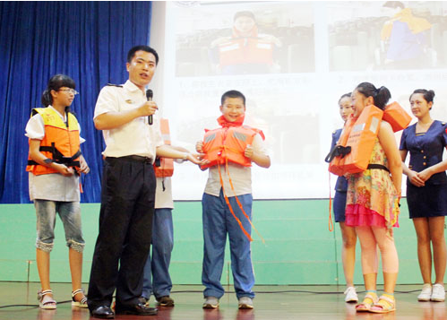“据统计我国每年有14460名中小学生在各种意外事故中死亡。其中,溺水死亡人数居首位,占总死亡人数的70%左右。” 6月27日下午,市金海岸小学,当日照海事局海上搜救中心的工作人员打开PPT上面显示这些数据时,偌大的活动室里,瞬间安静了下来,同学们紧紧地盯着大屏幕,若有所思。 当日,一场“水上安全知识进校园”活动走进该校,500多名小学生在日照海事局工作人员的讲解下,现场学习了水上自救、防范溺水等知识,并现场进行了互动交流。 海事人员讲解了防范溺水、逃生自救技巧等安全知识,现场演示了救生衣的规范穿着方法。日照海事局还向学校捐赠了10件由“@山东海事”官方政务微博面向社会征集的公益救生衣,供学校开展水上安全教育使用。 据了解,“水上安全知识进校园”活动是交通运输部、教育部联合部署,旨在普及水上安全知识,防止学生水上交通意外伤害、溺水等事故发生,增强水上交通安全意识和水上事故自救能力。 今年6月是第13个全国“安全生产月”,主题是“强化红线意识、促进安全发展”。山东海事局将“水上安全知识进校园”活动列为“安全生产月”的一项重要宣传教育内容。日照海事局自2013年实施“水上安全知识”进校园活动至今,已累计为近5000名学生送去水上安全公益课。