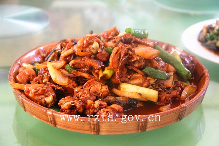 辣炒跑山鸡:有山的地方自然不会少了跑山鸡这道菜。跑山鸡吃的是山林中的昆虫、草籽、小型两栖动物等,远离污染源,没有激素,肉质细嫩,鲜香味浓郁,富有浓厚的野味特点。很多都觉得这种鸡能吃出小时候的鸡肉味来。这种鸡锶和钼的含量比普通鸡高10%,还有防治癌症的作用。