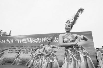 7月15日,太阳文化节上演员们正在表演太阳文化节目。当日, 2014中国·日照国际海洋城太阳文化节在涛雒镇天台山举行,羲和老母揭拜典礼、祭日大典、太阳文化文艺演出等八项精彩活动吸引了近千名村民和游客参加。日照是与古印度、埃及、希腊、玛雅齐名的世界五大太阳文化起源地,日照太阳文化研究会从2010年开始,于每年农历六月十九日在涛雒天台山举办日照太阳文化节。