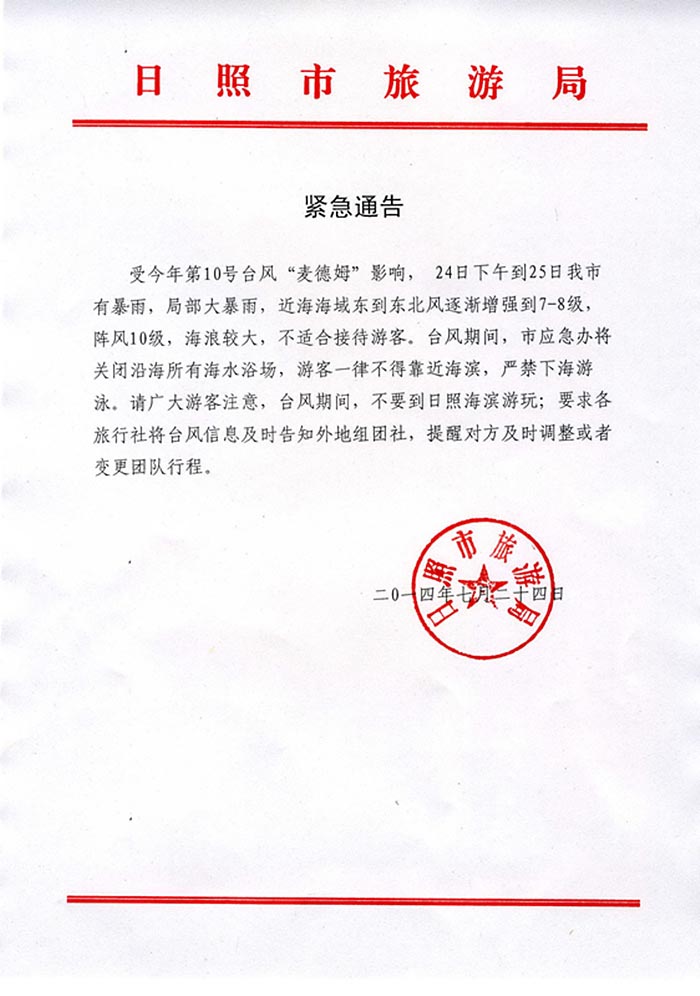 关于做好防御“麦德姆”台风的紧急通告(2014年07月24日)