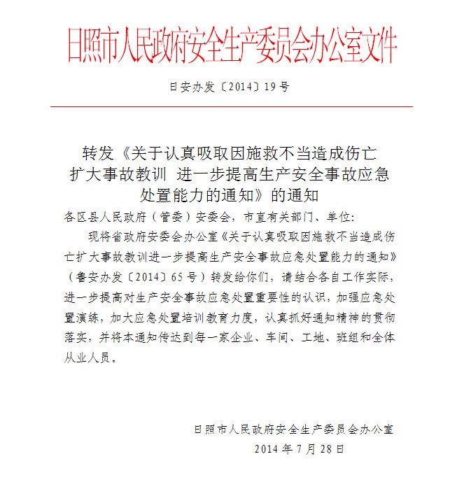 关于转发“吸取因施救不当造成伤亡教训 进一步提高安全事故应急处置能力”的通知(2014年07月30日)