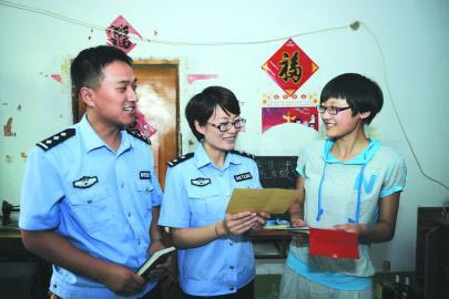 7月30日,东港区西湖镇袁家庄村,考生刘清华(右一)向日照港公安局西区派出所的民警展示刚刚收到的录取通知书。 刘清华是日照实验高中高三33班学生,今年高考,她以高分考取了同济大学环境科学与工程类专业。刘清华的爷爷奶奶身体不好,父亲去年打工途中遭遇车祸至今未痊愈,家里全靠妈妈操持。 本报7月23日头版的图片报道《这个假期有意义》引起了社会各界的关注,得知其家庭困难后,30日上午,日照港公安局西区派出所民警把民警和日照港老龄委第三支部的2000多元捐款,送到了刘清华手中,为其解决燃眉之急,助她早日圆梦。