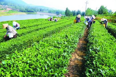 近日,农民在岚山区碑廓镇丁家村的有机茶场采茶。 碑廓镇以打造生态示范村、“乡村连片治理”项目为切入点,突出示范村建设,投资1000万元,打造10个生态建设典型村。继续巩固2012年创建的“一个片”和“一条线”15个示范村,提升2013年创建的“一个圈”12个村。在此基础上,以点带面,强力推进了曹家岭、曹家庄等13个生态示范村。同时,打造了碑廓一村乡村公园等景观节点3处,修建了绣针河绿色通道14.6公里,栽植白蜡2.1万株,法桐6000株。