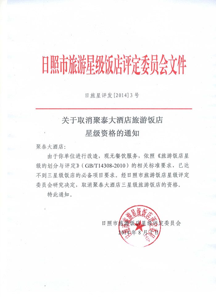 关于取消聚泰大酒店旅游饭店星级资格的通知(2014年08月08日)