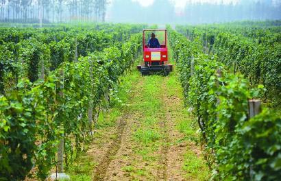 8月16日,在五莲县潮河镇日照尧王集团千亩葡萄园内,工人利用土壤深松机械进行管理。近年来,日照尧王集团加快企业结构调整,实施了“以工促农”战略,让工业反哺农业、带动农业发展、促进农业转型升级、实现农业产业化,为农民提供了增收致富的有效途径