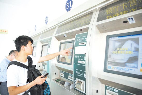9月22日,日照火车站一位市民正在选用自动售取机购买车票。