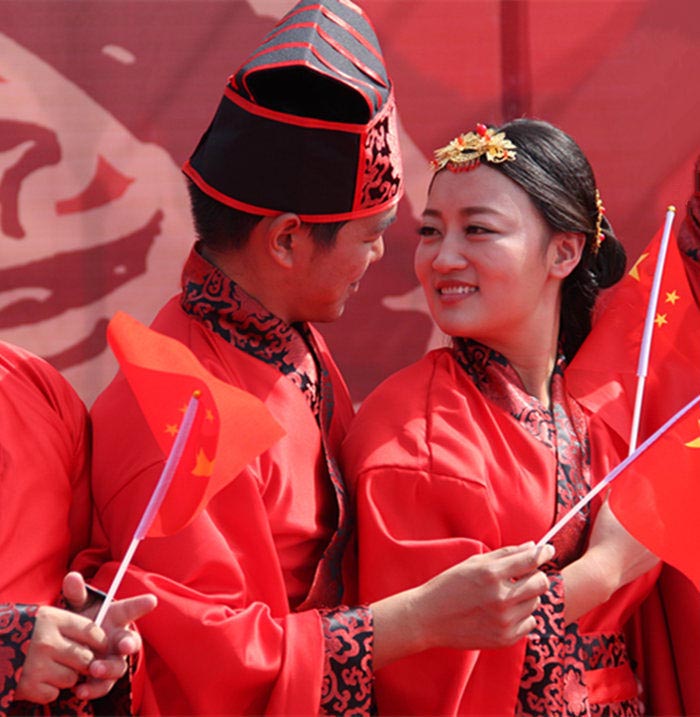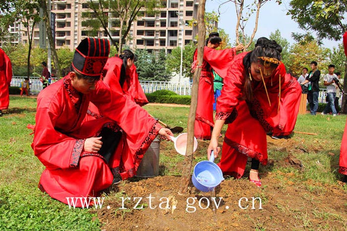 本次婚礼大典采用了典雅、庄重的传统汉式周制婚礼形式,通过同牢礼、合卺礼、执手礼等环节让新人在汉式婚礼中充分品味我国传统文化的底蕴。“死生契阔,与子成悦。执子之手,与子偕老”,18对新人在汉式婚礼上许下了守护彼此一生的爱情誓言。婚礼礼毕,新人们来到位于海曲东路北侧的结婚纪念林载下了18棵新婚纪念树,既寓意百年好合,又表达了一种低碳生活的理念。