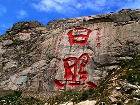 在河山,您可以观摩到世界上最大的摩崖石刻——“日照”两个大字,每个字高约20米,与雄浑的山势相映成趣,颇为壮观。河山风景区于20世纪九十年代初建,通过近二十年的环境保护与植被恢复,自然环境在日照已名列前茅。区内的“日照巨书”摩崖石刻为日照市标志性景观,与海滨金沙滩共同享誉天下,是日照旅游规划“山海游”的重要景点。