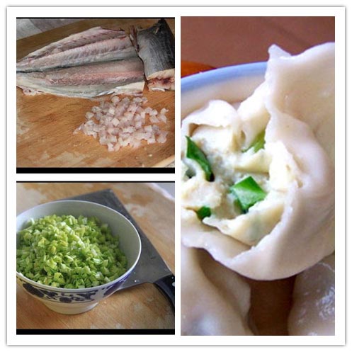 在市场买条新鲜的鲅鱼让店家给处理好之后,还要清洗干净。沿着鱼骨片成2大片。用勺子或是直接用刀把鱼肉挖下来。把挖好的鱼肉集中。加入姜末剁碎。剁的过程中要多加水,成泥即可。加入韭菜和葱花搅拌。饺子皮包入即可。下锅煮开,捞出即可。