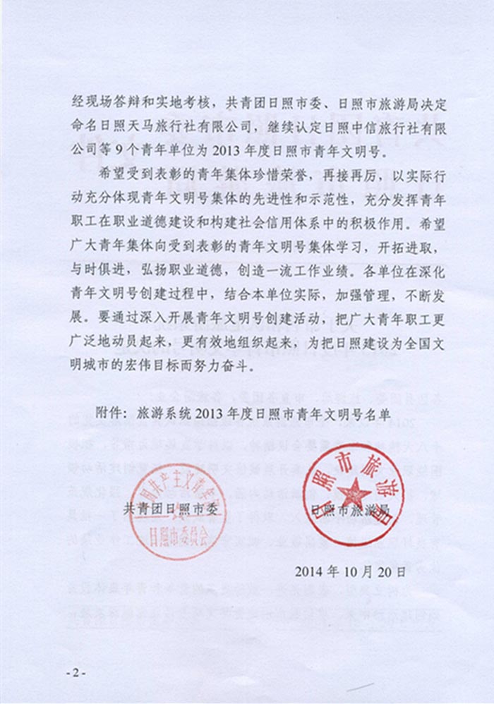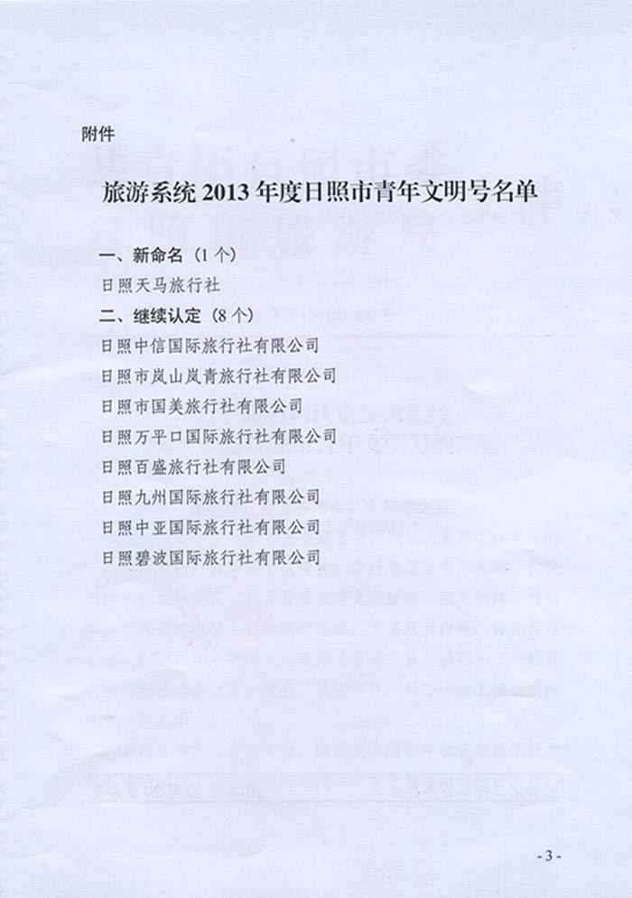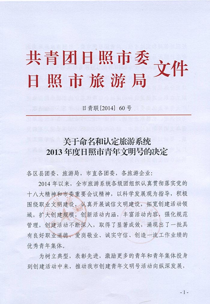 关于命名和认定旅游系统2013年度日照市青年文明号的决定(2014年11月11日)
