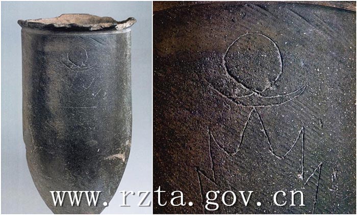 新石器时代大汶口文化中晚期遗存。距今约5000年前的礼器,1960年陵阳河遗址出土。腹上部刻有陶文“日云山”此类陶文莒县陵阳河、大朱家村、杭头等三处遗址均有发现,现已出土八种类型20个单字。在莒县陵阳河、大朱家村遗址正东方,分别耸立着寺崮山。屋楼崮两座山峰。每年春分、秋分时节,早晨红日正从山顶冉冉升起,就依稀呈现出“日云山”形图像。这是莒地先民“日出而作,日入而息”长期观察太阳发现了春秋二分的天文奥妙。“日云山”是东海之滨的莒人为祭祀太阳神,因形见义,随体诘的杰作。最初为祭祀的祭文,反映一个事物。