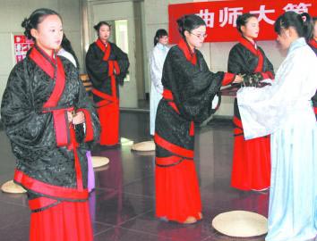 11月23日,日照市首届集体汉服成人礼在曲阜师范大学成功举行。 整场活动在庄严唯美的汉舞——“礼仪之邦”中开始,所有工作人员均身着“汉服”,所有流程均严格按照典籍记载,依次按照“国歌开礼”、正宾盥洗、上香读祝文、合髻施掠、加笄着衣、醮子、赐字、礼尊、聆训等流程,最后以筓者代表的茶艺表演和向师长的奉茶而结束全场活动。本次活动通过庄严古朴的仪式为青年传达着了成人之义。 中国自古以来就有衣冠上国,礼仪之邦的称谓,本次活动旨在通过对传统服装和礼仪的展示来向社会群众和众学子打开传统文化的大门,号召社会各界一起来保护弘扬优秀传统文化!