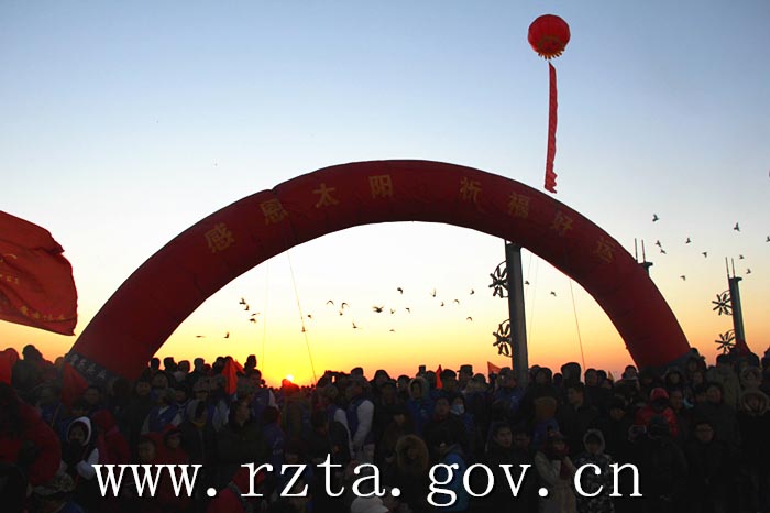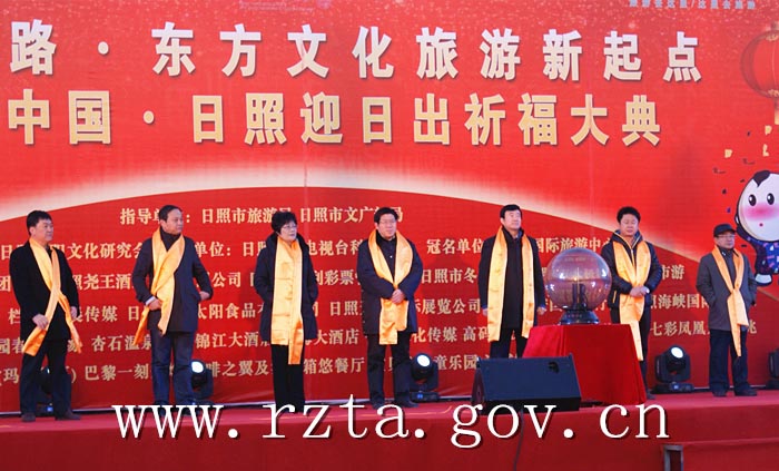 1月1日,2015“好客山东 多彩日照”贺年会的开场大戏—“丝绸之路·东方文化旅游新起点”迎日出祈福大典在日照市万平口演艺广场隆重举行。本次活动由日照市旅游局、日照市文广新局指导,日照太阳文化研究会主办,山东国际旅游中心冠名。日照市人民政府副市长杨留星、日照市旅游局局长王立新、日照市文广新局局长郑玉霞、日照日报社总编管锡云、日照市城投集团副总经理李志锋、日照三运集团董事长郭方泉、日照太阳文化研究会会长范海钧,市旅游企业代表,各行各业的热心市民,国内外游客,中央、省、市媒体的记者们约8万余人参加了活动。