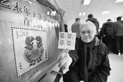 1月5日,73岁的许树娟老人在日照海滨三路邮电支局购买到第一个《乙未年》邮票四方联。 当日,中国邮政发行《乙未年》特种邮票1套1枚,全套邮票面值为1.20元。该套邮票是中国邮政发行的第三轮生肖邮票的收官之作。《乙未年》邮票由吴冠英设计,以绵羊作为造型基础,羊角装饰有缠枝花草纹,羊身上为牡丹、莲花等花卉图案,并伴以祥云、水波纹,整个画面蕴含着吉祥、圆满和幸福绵长的寓意,寄托了对新的一年的美好祈盼。