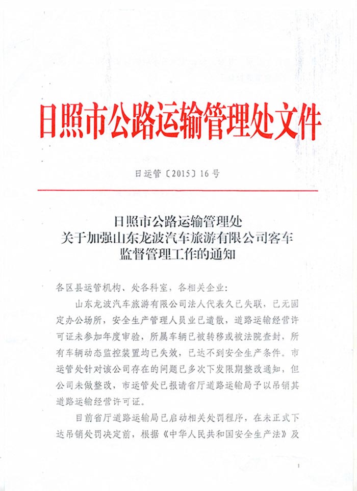 日照市公路运输管理处关于加强山东龙波汽车旅游有限公司客车监督管理工作的通知(2015年03月02日)