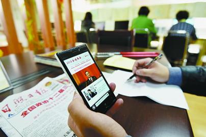 3月4日,东港区秦楼街道城市花园社区的居民用手机关注全国两会。 据悉,市民通过电视、报纸、广播等传统媒体关注两会的同时,也利用微博、微信等新媒体参与其中,收入分配、反腐倡廉、环境保护等热点成为百姓瞩目和谈论的话题。