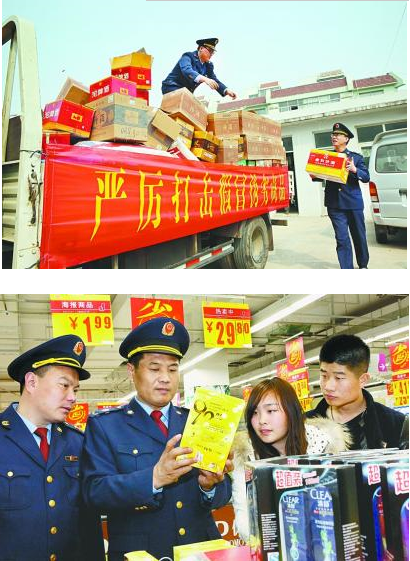 3月13日,工商执法人员在搬运假冒伪劣商品。当日,东港工商部门联合东港公安在市固废中心销毁近年来查处的假冒伪劣商品,维护安全放心的消费环境。 (本报记者 惠雪烨 摄) 3月12日,莒县工商人员在对几位消费者进行消费常识“科普”,教他们如何避免假货和保护自身合法权益不受侵害。