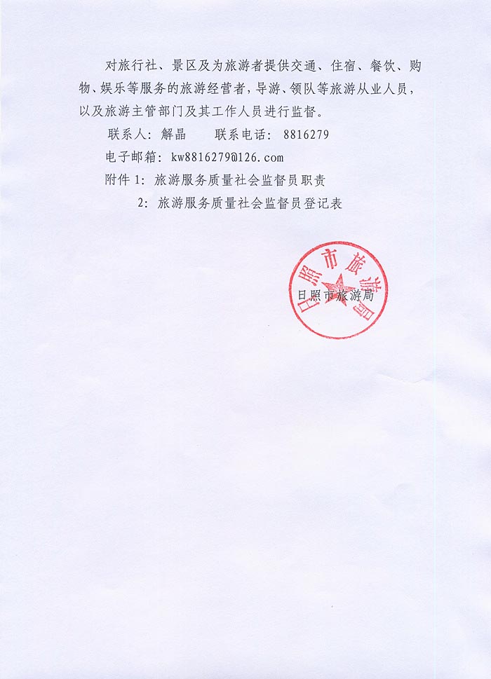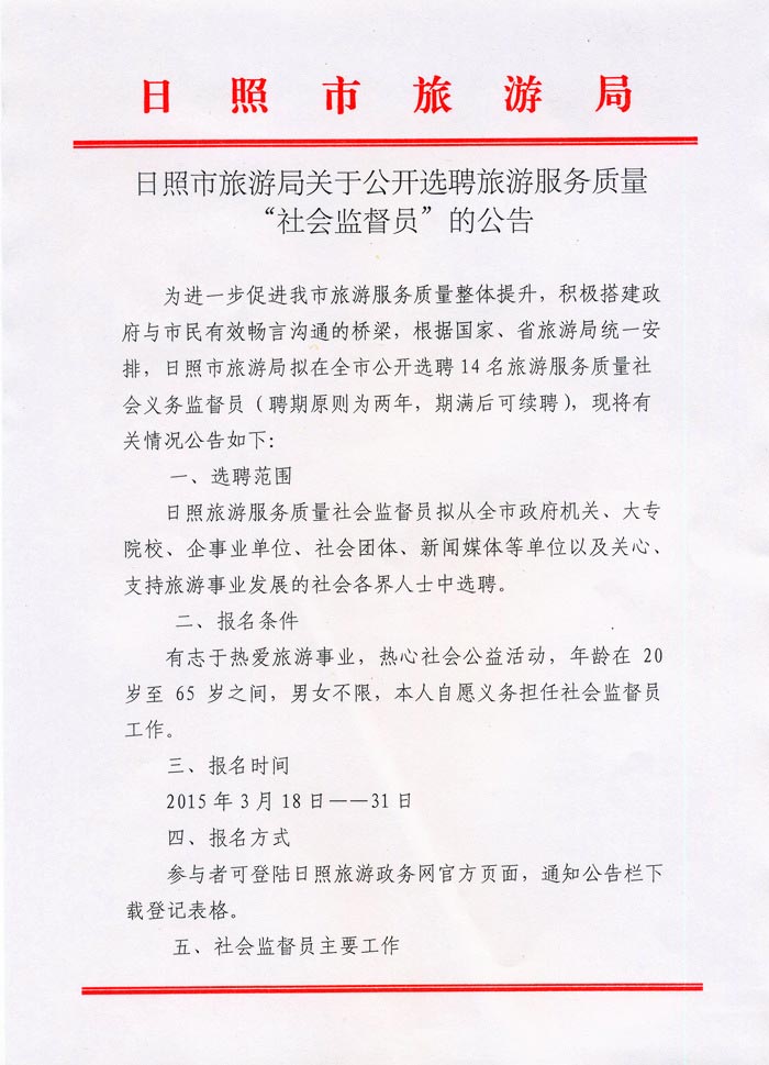 日照市旅游局关于公开选聘旅游服务质量“社会监督员”的公告(2015年03月18日)