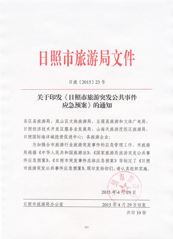 关于印发《日照市旅游突发公共事件应急预案》的通知(2015年04月29日)