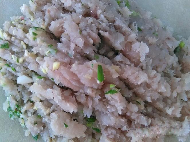 再将葱、姜切碎,跟鱼肉一起剁馅儿,看这一堆剔的很干净的鱼肉就已经流口水了呀。再把搅拌好的鱼肉馅和提前剁的五花肉一起搅拌均匀,五花肉可是做鲅鱼水饺的黄金搭档,鲜香的海之味,跃然鼻尖。
