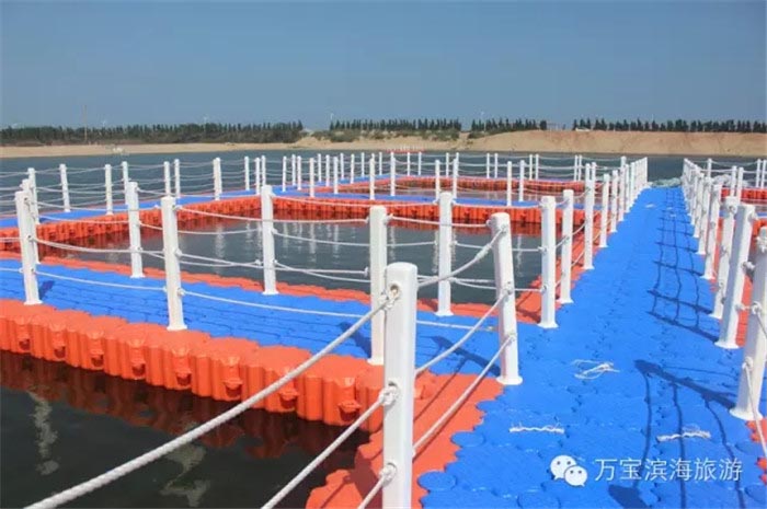 贝尔水上乐园是日照沿海一处大型水上游乐场地,占地70亩,其中水上浮桶组装面积1300平方米。浮桶材质采用高分子量高密度合成材料,为抗腐、防冻、抗氧化、抗紫化线的强化材质,不受海水、化学品、油渍及水生物的侵蚀;无污染、不破坏环境.浮筒体上部表面采用防滑花纹设计,安全稳固;四角皆为圆弧钝角造型,避免一般水泥、木制、铁制设施所常见的危险,例如:滑倒、被碎木屑、锈钉刺伤等,承载力高,筒体平稳、耐久,每平方米的浮力可达350kg以上。它的主要功能是亲水平台、网箱养殖、水上舞台。