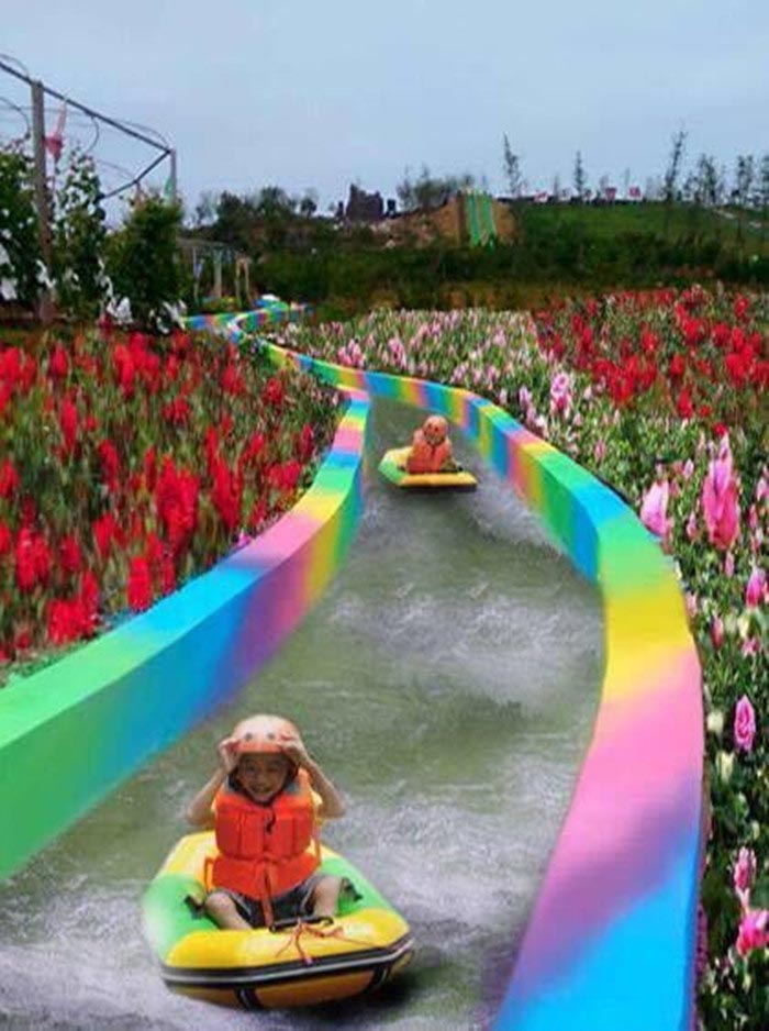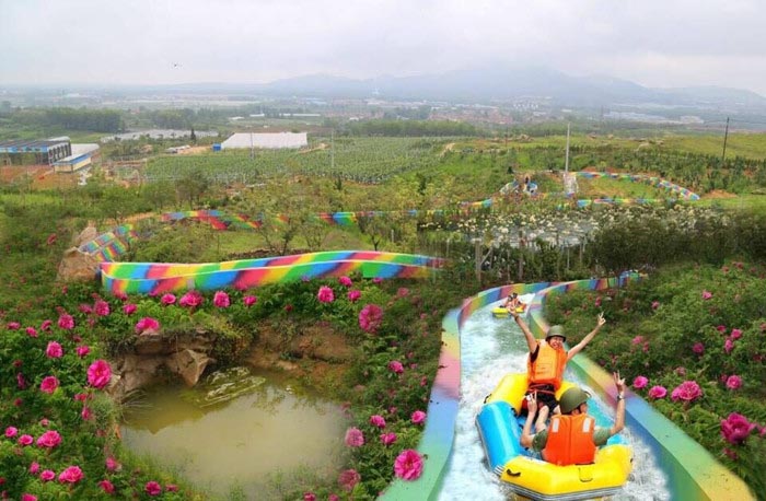 沁园春独特的五彩滑道,弯转曲折,滑道两侧绿树成荫,瓜果飘香,玫瑰花的芬芳不时地沁入你的心脾.......