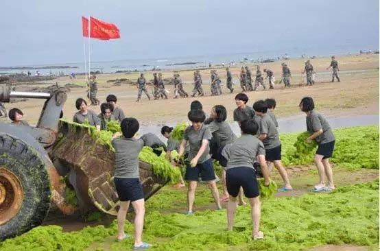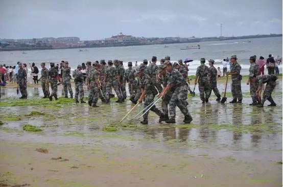 7月20日下午三点,71345部队组织官兵前往受浒苔影响的阳光海岸景区,帮助阳光海岸旅游管理中心工作人员清理浒苔。