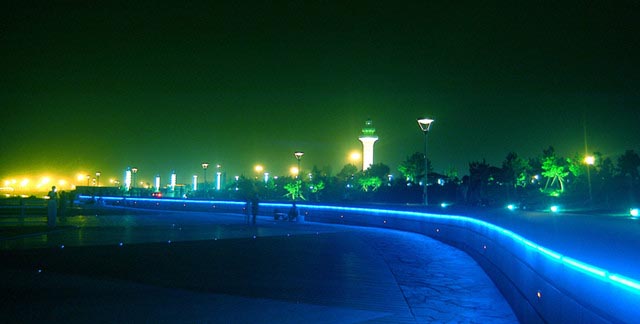 五彩灯阵、绿化带、木栈道、远处的礁石群,加之夜晚繁星般的灯火和白色张拉膜的映衬,使此地无不显示日月同辉的景观。登塔俯瞰,五台阶水幕和两侧水线如七彩音乐欢畅流动;呈放射状排列有序的银杏树和景观灯柱与灯塔相融合,愈加烘托出灯塔的高大挺拔,整片景观在夜晚灯光的映射下显得流光溢彩、如影如幻。同我在这里听潮落、看繁星,可好?
