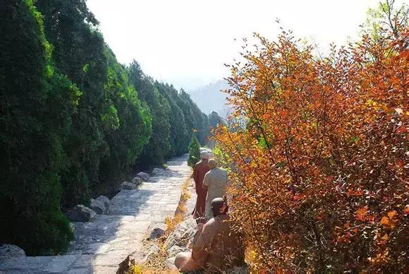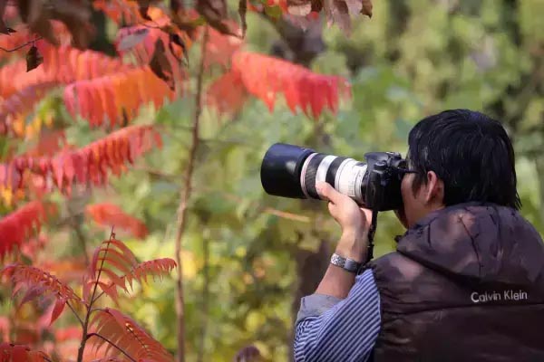 景区内的黄栌、火炬等树木进入秋季,树叶开始泛红,竞相斗艳,红彤彤的枝叶吸引了大批游客和摄影爱好者前来观赏拍照。