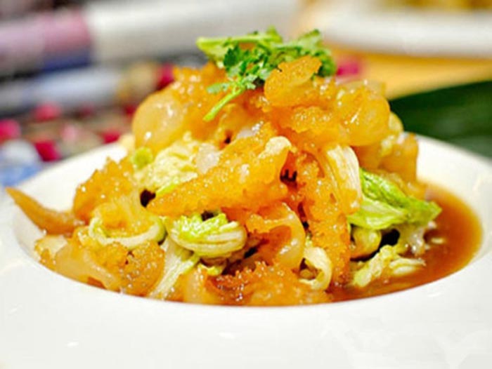 合味蛰头,用海蛰头、白菜叶、干椒、香菜梗、盐、味精等做料,用西瓜刻成西瓜盅座,蛰头清水泡去咸味后,切块、白菜叶撕成块,锅上火下白菜叶煸软,加烫过蛰头快速爆装盘,放瓜盅座上即成。吃起来感觉到蛰头爽脆、白菜鲜嫩。