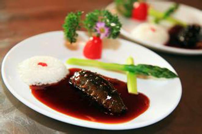 海参泡饭:将海参用耗油、鲜汤烧制,配以油菜心、米饭制成的营养丰富,色泽搭配美观的一道高档菜肴。