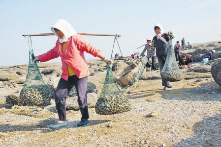 11月3日,随着潮水的退去,许多市民和游客赶到沙滩上挖牡蛎,不少穿着皮裤拎着工具的人们小心翼翼地踩着礁石,趟过齐腰深的海水,到难得露出海面的礁石上挖牡蛎。 “冬季退大潮,露出更远的滩涂,所以能多挖一些牡蛎。”一名市民说。
