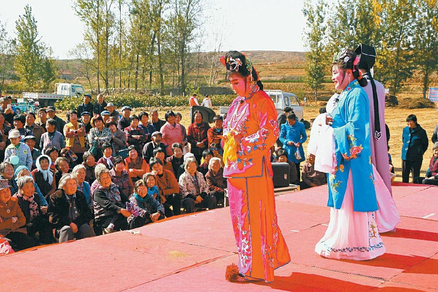 11月3日,在东港区南湖镇大集上,来自日照阳光吕剧团的演员们在为当地群众表演吕剧《姊妹易嫁》。 今年以来,东港区以戏曲文化活动为载体,推出“弘扬传统文化”送戏下乡活动,将戏台扎在村民家门口,满足群众多样化的文化需求,倡导和谐向上的文明新风,受到农民的热烈欢迎。截至目前,区级以上剧团已演出73场,镇级庄户剧团演出186场。