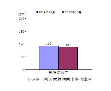 10月份,日照港边界空气PM10平均浓度为107微克每立方米,与去年同期相比,浓度下降2.7%。
