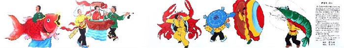 至清代,演出时就穿上画有海洋生物图案的服装,脸上画着海洋生物形象的脸谱,用锣鼓伴奏,成了有声有色的舞蹈。再后来,就用竹子和布料扎制鱼、鳖、虾、蟹、蚌等海洋生物模型,表演时或顶在头上或背在背上,海洋生物动作被栩栩如生、活灵活现地展现出来。例如:鱼的嘴巴张合自如,尾巴能够随意摇摆,蟹的爪子能伸能缩还能抓物等。