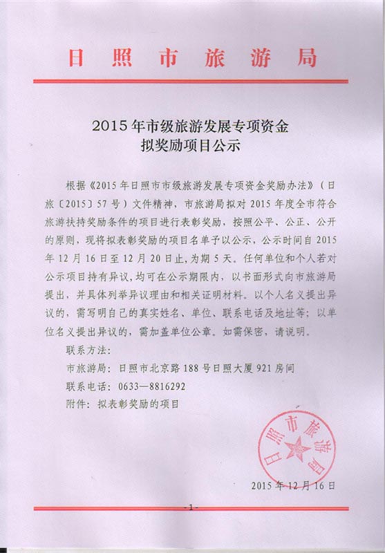 2015年市级旅游发展专项资金拟奖励项目公示(2015年12月16日)