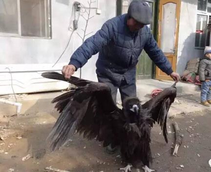 近日,莒县洛河镇小汪头村村民赵学臣去自家田里时,远远看见一个黑色的东西在动,起初他以为是小孩蹲在那里,不一会,那黑色的东西却展开翅膀飞起来,好奇心驱使他上前看个究竟。那只“巨鸟”飞了不久身子便往下沉,最后飞不动了,落到了地上。赵学臣跑到它跟前,发现这只“巨鸟”像生病了一样,没有精气神,他就赶紧把它抱起来带回了家。 这只“巨鸟”身高有0.8米左右,展开翅膀体长近3米,通身黑褐色的羽毛,嘴巴尖而带钩,具有攻击性。不知是什么原因,抱回家的“巨鸟”一直在吐,赵学臣对其精心护养并及时上报有关部门。目前,这只“巨鸟”已被县林业局带走。据网上查证,该“巨鸟”酷似国家二级保护动物——鹫类。