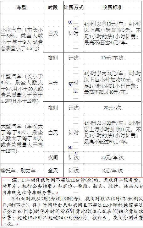 停车服务收费采用计时收费和计次收费相结合的方式。具体收费标准见下表: