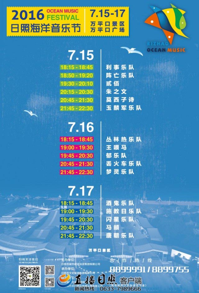 为积极响应“旅游富市”战略,持续打造“日照海洋音乐”文化品牌,经市政府审批同意,定于7月15日至17日,在万平口景区(万平口广场)举办“2016日照海洋音乐节”活动。 本届日照海洋音乐节将有16组国内知名乐队、艺人登台献艺,涵盖民谣、金属、朋克、硬核等多种风格。有中国重金属摇滚乐的开创者、中国最具影响力、最具传奇色彩的乐队唐朝乐队;独立民谣厂牌麻油叶创始人马頔;先锋独立音乐人、在中国好歌曲上大放异彩的莫西子诗;还特别邀请到从一位农民歌手走上央视舞台的大衣哥朱之文。 据悉,活动举办三天期间,万平口景区广场区域(万平口景区1号门)实行单独封闭管理,观众一律凭音乐节门票入场,不适用一卡通、身份证入场;万平口景区其它区域(2、3、4、5号门)仍按照原规定,通过购买景区门票、一卡通、身份证等方式入园。 音乐节单日票价为120元,本地市民可凭身份证及一卡通、本地大学持学生证等有效证件可享受60元优惠票价。外地游客可通过现场预售、同程网及旅行社团购等购票通道,享受相关优惠政策。