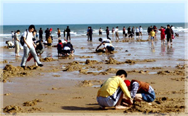 刚刚退去的潮水冲上沙滩来许多贝壳蛤蜊,还有躲在沙子里和石头缝里的小螃蟹。游人和当地村民带着小铁楸,提着小水桶,大人小孩老人一起拾贝挖蛤,享受收获的喜悦。