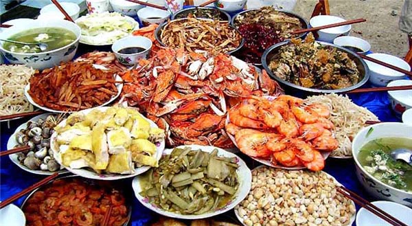午饭时间到!渔民从水池中捞出新鲜的海鲜,我们把上午拾来的贝壳、蛤蜊、小螃蟹交给村民加工。不一会,上来一大桌新鲜的海鲜大餐。味道就一个字:鲜!