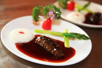 将海参用耗油、鲜汤烧制,配以油菜心、米饭制成的营养丰富,色泽搭配美观的一道高档菜肴。