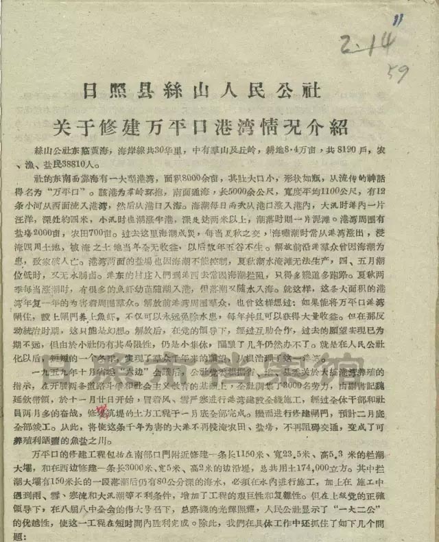 日照县丝山人民公社关于修建万平口港湾情况介绍(1960年2月14日)