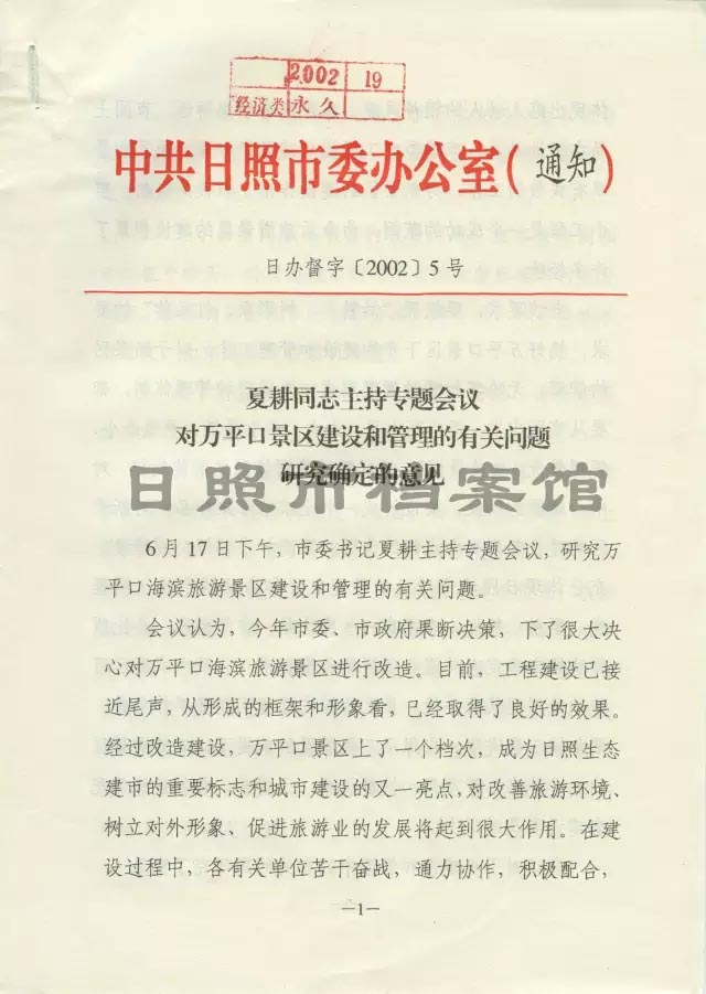 《夏耕同志主持专题会议对万平口景区建设和管理的有关问题研究确定的意见》(2002年6月17日)