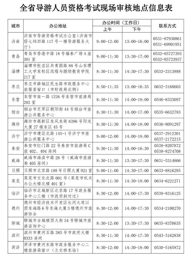 距截止报名还有12天 网站 http://ksbm.sdtg.gov.cn 报名时间 2016年7月29日9:00至8月29日20:00 照片要求 白底,两耳及额头无遮盖,jpg格式、288×385像素、大小不超过300KB。 现场审核 通过照片审核的考生于2016年9月20日前到所在地市旅游局(委)进行现场资格审核 审核材料 1.报名信息确认表1份。报名系统自动生成,考生自行打印并核对信息无误后签字确认。 2.本人有效身份证明原件及复印件1份。包括身份证或临时身份证或户口簿或有效期内户籍证明。 3.本人学历证明原件及复印件1份。须与报名时使用的学历信息一致。 4.本人健康证明原件。指有资质的检测机构(疾控中心、医疗机构等)出具的日期在2016年6月1日(含)之后的身体健康体检合格证明,无统一格式,不要求必须由县级以上医院提供。 5.外语加试考生须提交中文导游员资格证书原件及复印件1份。 6.旅游中等职业学校导游专业2017年毕业生报考的,须提交由就读学校学生处开具的导游专业2017年毕业生证明原件。 缴费时间 通过现场资格审核的考生,网上交费时间为2016年9月7日9:00至9月21日17:00。交费完成后,报名费不予退还。 缴费金额 新生考生:¥260 外语加试:¥110 考试时间 科目一、二考试时间:2016年11月5日9:00-10:30。 科目三、四考试时间:2016年11月5日10:30-12:00。 两场次之间不安排休息时间,考试内容不交叉。 科目五考试时间:2016年11月7日至12月7日(具体考试时间、地点详见准考证) 报名截止后,只有成功报名的考生可以在9月20日之前上传个人照片以及现场审核。