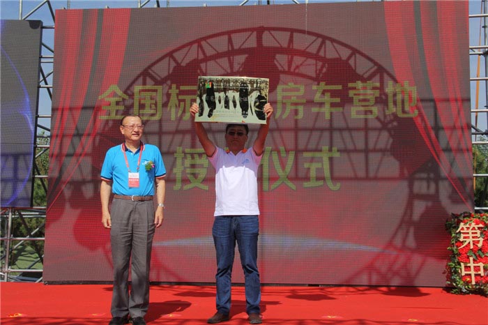 开幕式上,蓝海1号露营公园被授予“国家标准试点验证基地”。同时首旅集团北京华龙休闲公司为蓝海1号露营公园颁发“金蜗牛露营加盟”牌匾。